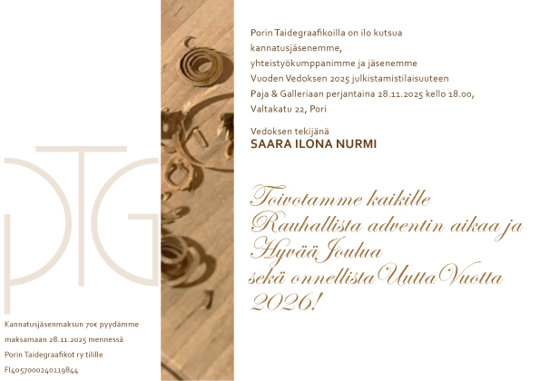 AJANKOHTAISTA Kutsu Vuoden vedos tilaisuuteen Kuva 18/11/2025 Porin Taidegraafikot Jaa: Click to share on X(Avautuu uudessa ikkunassa) X Jaa Facebookissa(Avautuu uudessa ikkunassa) Facebook Aiheeseen liittyy